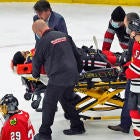 Jujhar Khaira leaves the ice on a stretcher. #Blackhawks pic.twitter.com/FQ13rQdFJn