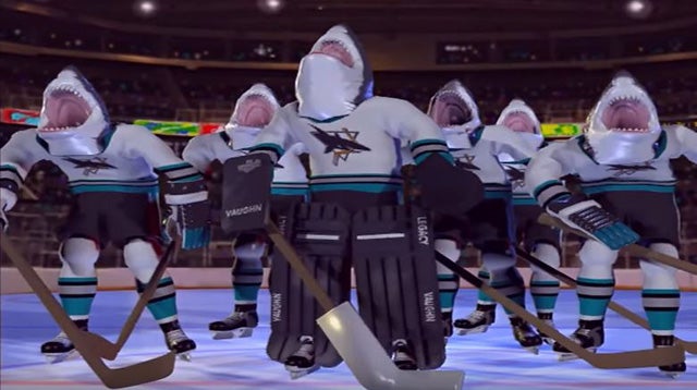 Then the sharks are flying over the ice before turning upright. Suddenly the team’s logo appears on their chests. Then they all convene at one end of the ice where they all morph into half-shark, half-hockey players ready to do battle.