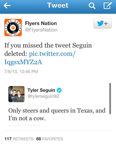 It wasn't long after that the tweet was taken down and Seguin issued an apology, alluding to the fact he was hacked. This was the second time in a matter of weeks that Seguin had a tweet referencing homosexuality as a tweet about coming out of the closet was also deleted and followed up with a hack apology.