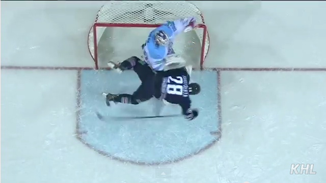He was briefly in the crease for their most recent playoff game against Mettalurg Magnitogorsk until he ended up getting himself ejected from the game after he lost his mind on Maxim Yakutsenya for taking up too much of his personal space in the goalie crease.