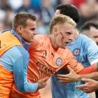 An Australian A-League club game between local rivals Melbourne City and Melbourne Victory was abandoned Saturday after a fan invasion of the pitch turned violent and resulted in City goalkeeper Tom Glover being hit in the head with a metal bucket. According to a report by ESPN, the pitch invasion was the culmination of a tense and unruly atmosphere stemming from the Australian Professional Leagues' decision to sell hosting rights to the league's Grand Finals to Sydney for the next three years.