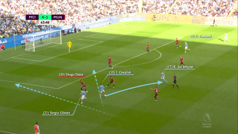 Or indeed Haaland's third, where Grealish has pinned back United's right back and dragged him infield so De Bruyne can lay the ball out to an overlapping Sergio Gomez, who crosses low to deliver another headline moment for the No.9. Grealish might even have taken the shot himself and probably scored. It was just the better play for the team was to let Haaland have it.
