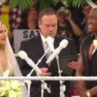 There was, as is to be expected, a very large, very fake-looking cake in the ring set next to where the officiant was conducting the ceremony. Lana cut the officiant off at one point when he mentioned having children, saying she would not have a monster baby making her fat. The crowd chanted "Rusev Day!" through the ceremony, leading Lana to yell at the crowd repeatedly. Lana informed Lashley that this was the greatest day of his career, life and manhood during her vows and chanting "Lana Day!" Lashley's vows were written by Lana. The two exchanged rings before the standard "if there is anyone with just cause why this man and this woman should not be married ..." bit. It was at that point where "Lana's first husband" interrupted. The man explained he married Lana when she turned 18, then she left him for Rusev. He then told Lashley that Lana would leave him for something bigger and better as she'd done to him and also to Rusev. Lashley hit him with a chokeslam, then the "speak now or forever hold your peace" part made another appearance, this time leading to Lashley's "first wife" interrupting. She said they met when Lashley was in the military but Lana laid her out before she could continue.